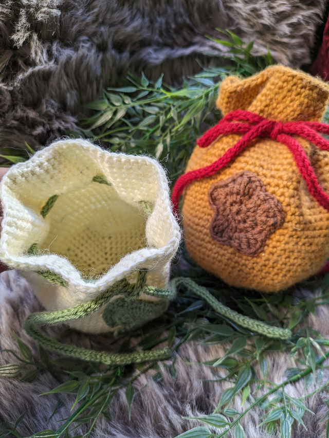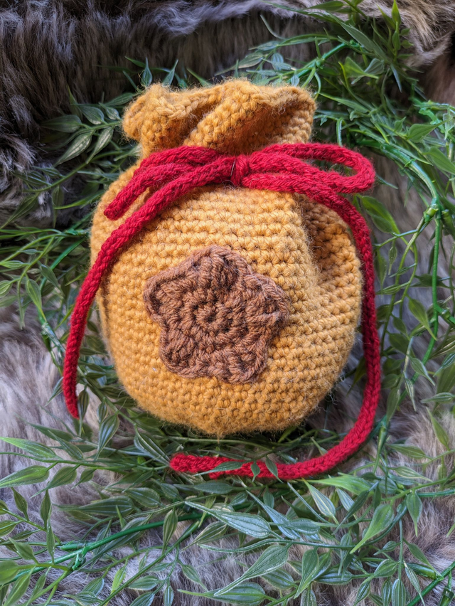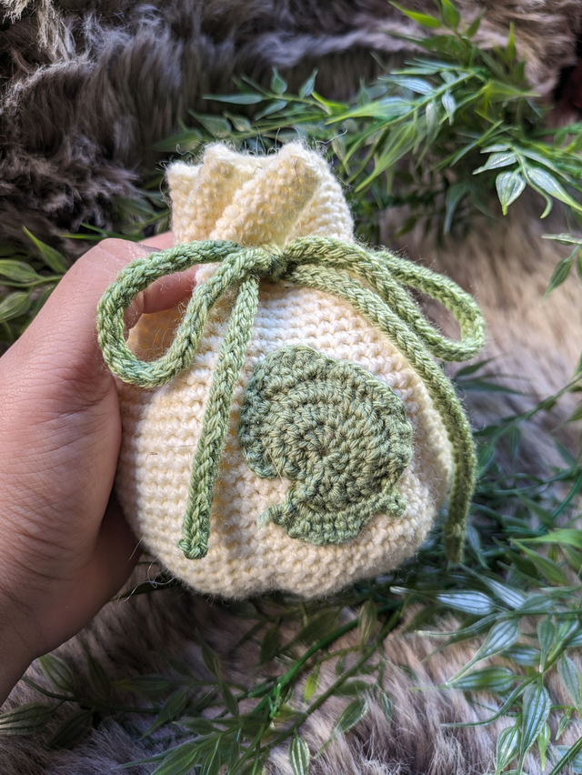 Chaque bourse est crochetée à la main avec soin, en acrylique, et se ferme par un cordon pour garder vos objets en sécurité.