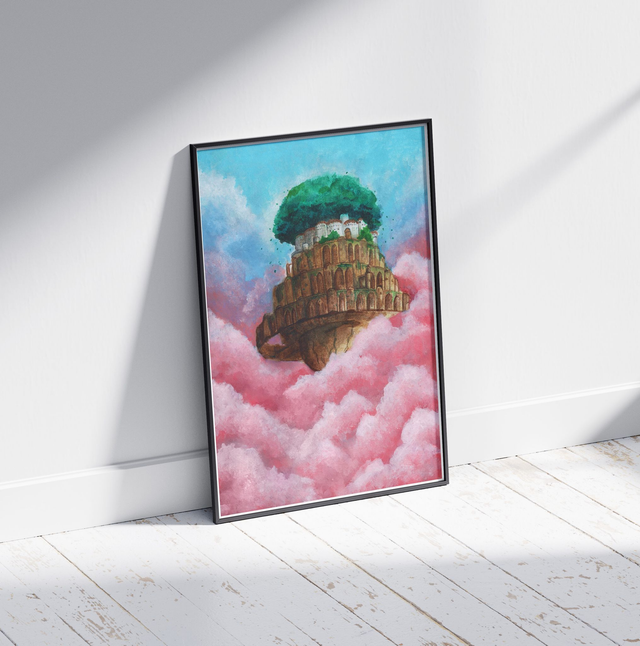 Une réinterprétation douce et onirique du Château dans le ciel de Miyazaki, vue de loin, flottant parmi les nuages.